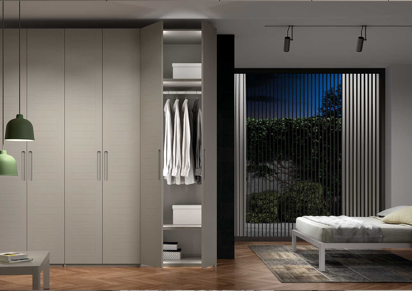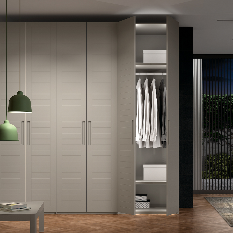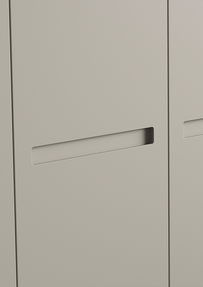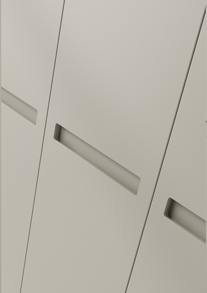 Chez Midi, nous créons votre armoire Ecco avec des portes battantes sur mesure, offrant une infinité de combinaisons de poignées, de matériaux et de finitions pour les structures et les panneaux.